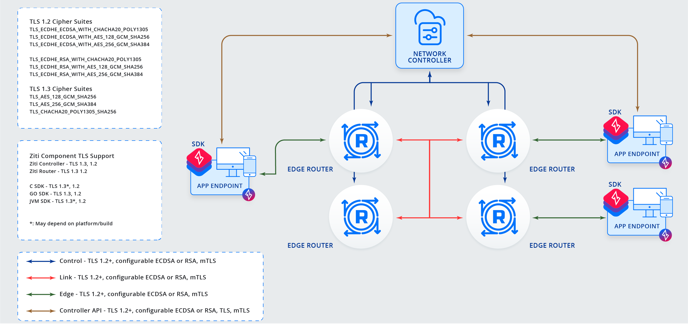 • edge - multiplexed connections between an SDK and an edge router that carries service connections. Secured via mTLS 1.2+